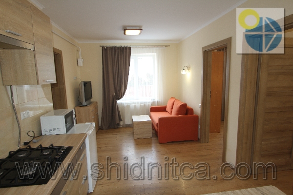Апартаменти (трикімнатні, 2-4 місні, загальна площа 45 м. кв.) - кімната 1 (двоспальне ліжко, супутникове ТБ); кімната 2 (односпальне ліжко, супутникове ТБ); кімната 3 (односпальне ліжко, супутникове ТБ); санвузол (ванна, унітаз, умивальник), кухня для самостійного приготування (кухонні меблі, обідній стіл, холодильник, газова плита, витяжка, набір посуду).